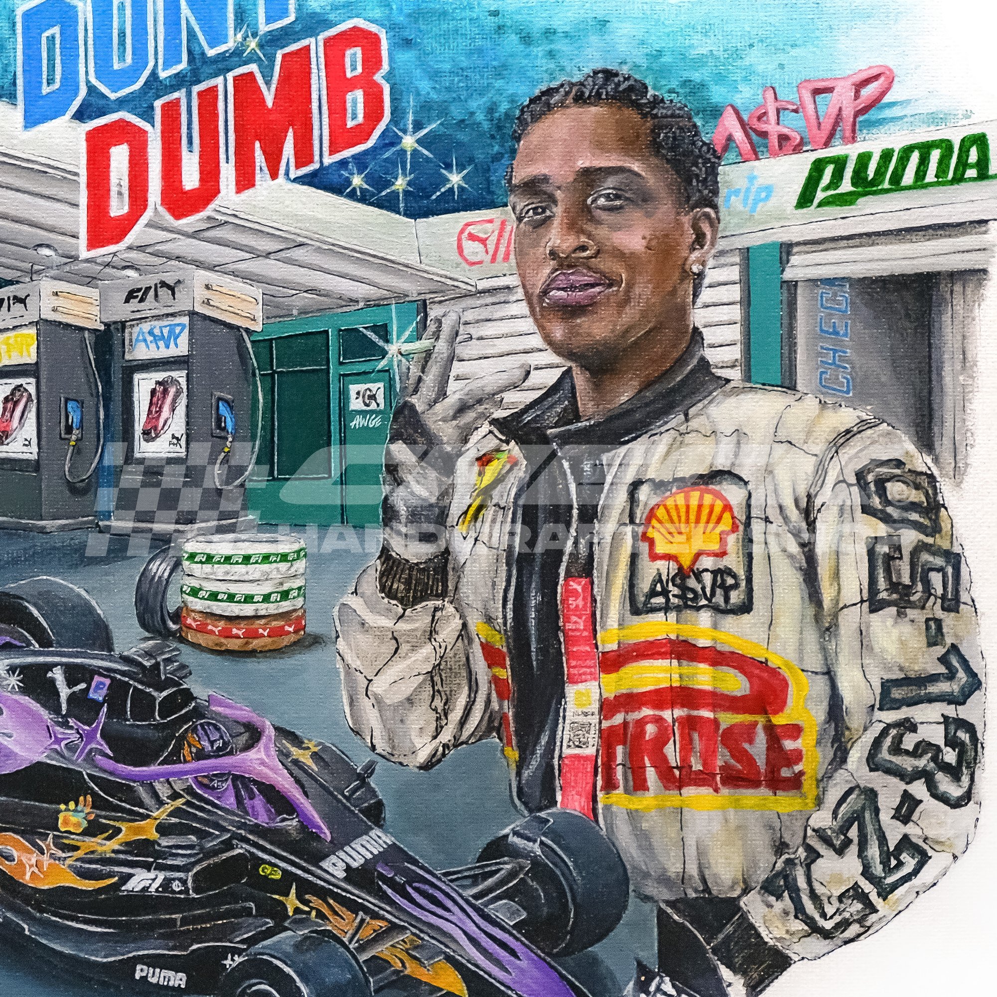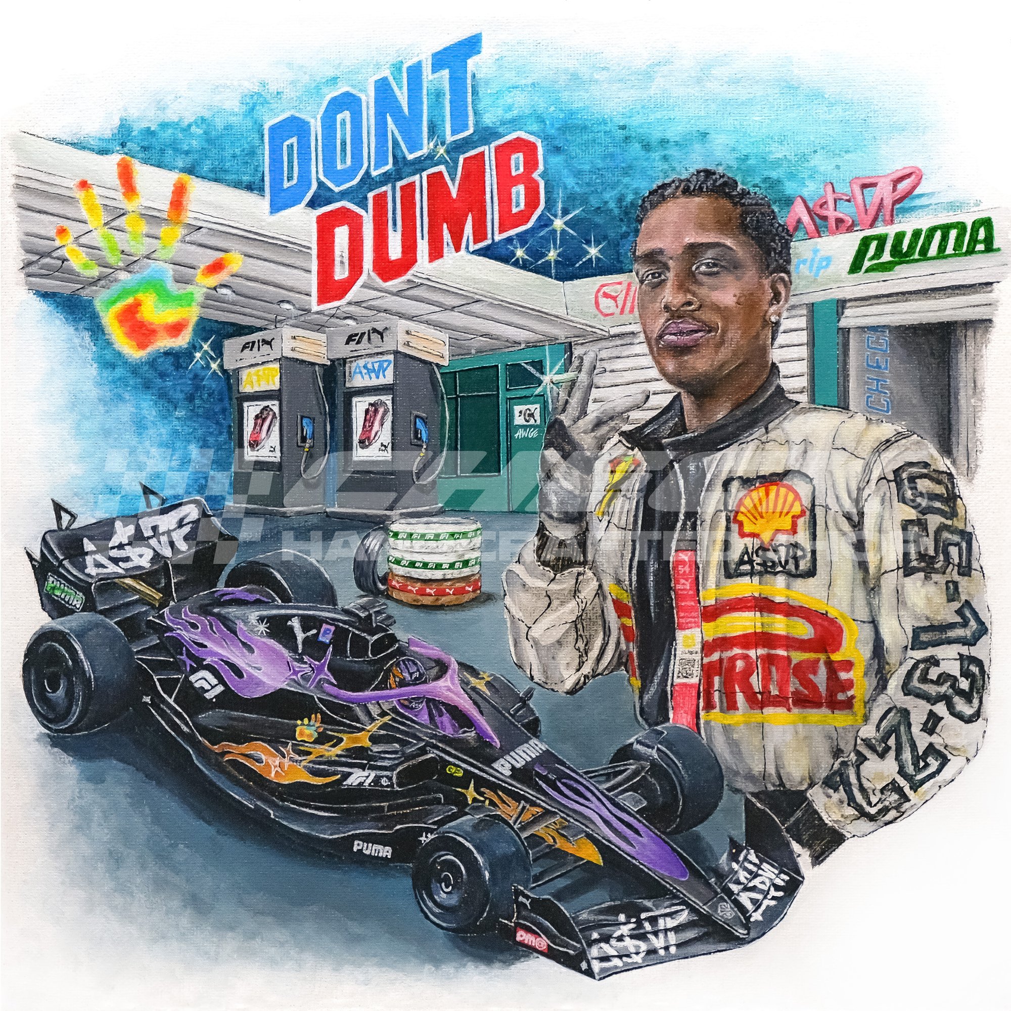 While waiting for A$AP Rockyʼs new album Donʼt Dumb, I painted this as a tribute featuring Rocky in a PUMA x F1 jacket and an AWGE Versions F1 car, with the album title up top like a cover.