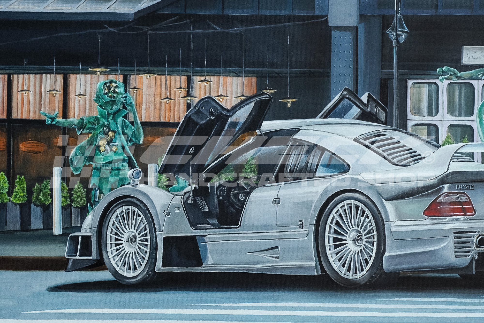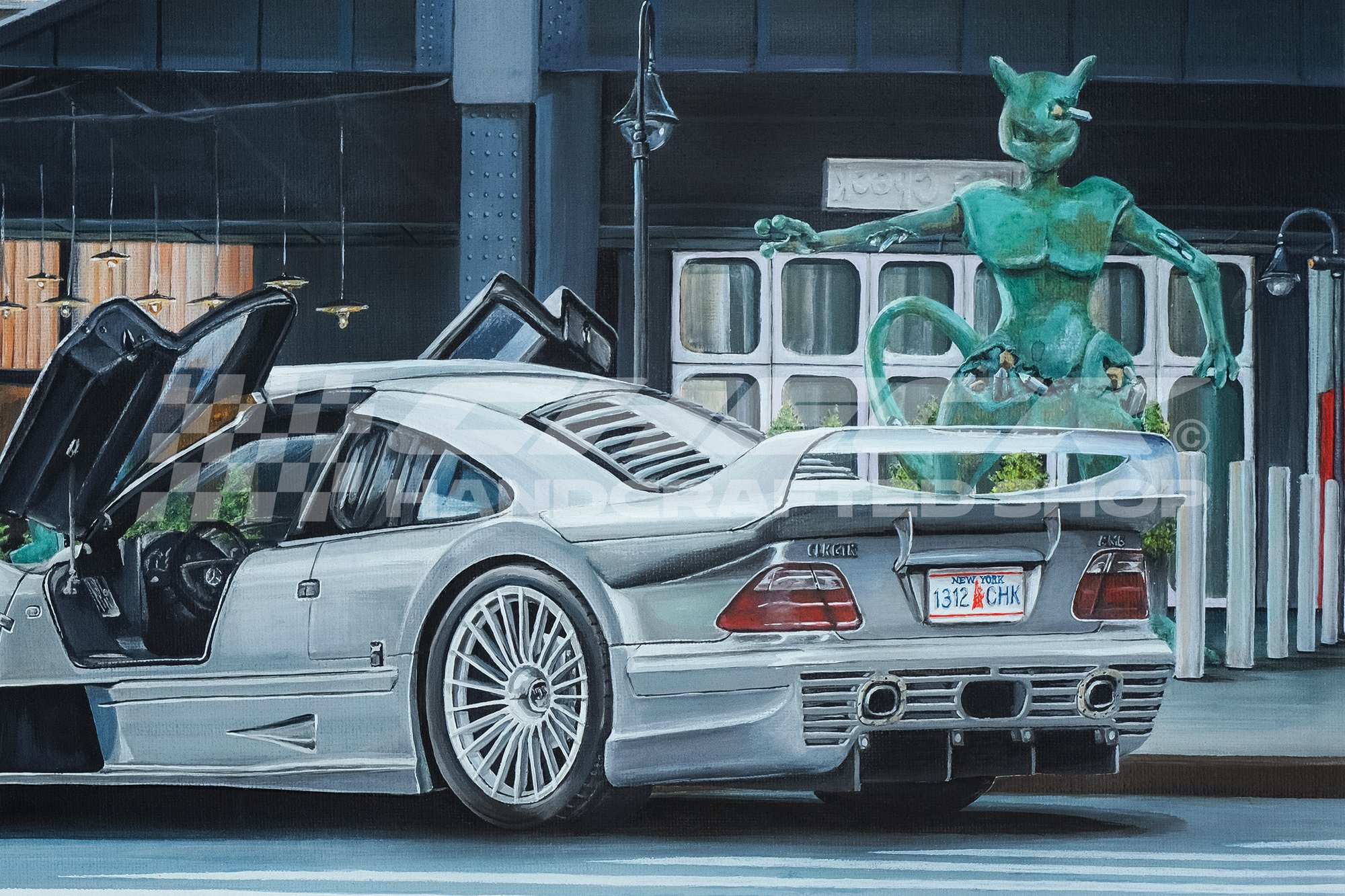 This piece blends the timeless beauty of the car with the vibrant energy of the city and its art scene.